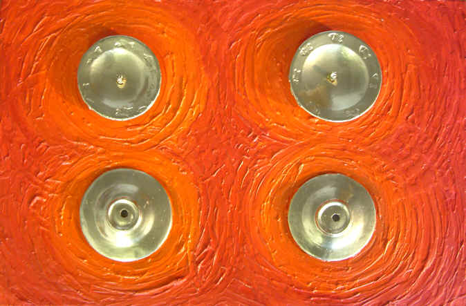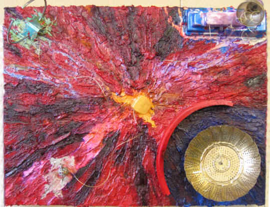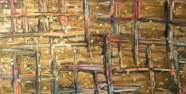 £1500 H25in x W49in 3D 63.5cm x 124.5cm) painting using acrylic paint, gypsum,wire, rubber, cloth, sawdust, paper, sacking on plywood 27-06-04 |