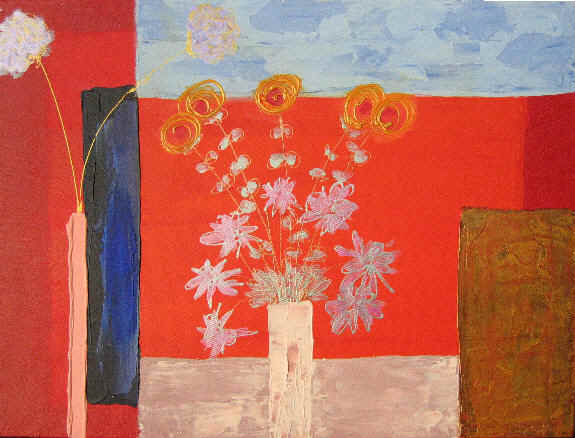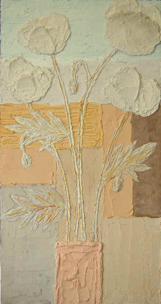 | 432... Pastel Poppies & Rectangles Price £200 H48in x W25in (120cm x 64cm) Acrylic paint & tile adhesive on plywood 04-04-04 |