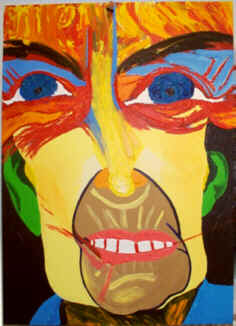 H122cm W91cm) Dated: 14-4-98 Medium: Acrylic on reinforced hardboard Price: £2,400 or $3360 My mother will be horrified to think that I took it from a picture of her but I did. In the event it also looks a bit like me (which is not surprising as I look a bit like her) which is good as the picture is called "Anger And Agony At The Loss Of Our Dear Anne" or something similar. The photograph below was taken at my sister's funeral and expresses complex emotions. There is certainly anger. The strained smile is also a grimace of agony at the loss of a child and best friend. There are few more awful things to have to face as a parent than having to bury your child and it does not matter how old she is. That agony is a tapeworm in the gut that can never be eradicated |