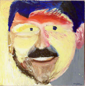 | Stephen Halstead H24in W24in (H61cm W61cm) Dated 19-10-94 Price £50 $70 Acrylic on hardboard Photo by Doug Lowe. I don't suppose Stephen would recognise himself. The moustache is a give away but other than that this, the second picture after the new beginning can only be thought of as an exercise on the road to some more polished work later. |